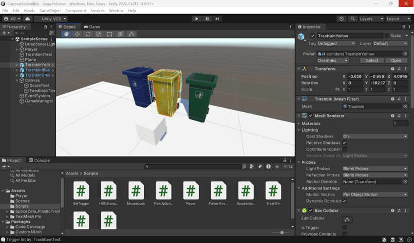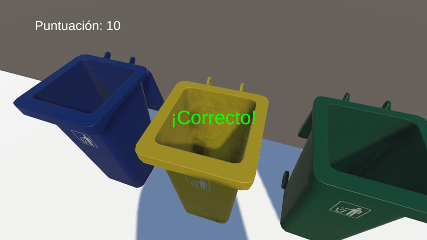 Gracias a esta estructura, el núcleo jugable del proyecto ya está completamente operativo, donde el jugador puede recoger residuos, clasificarlos correctamente y recibir retroalimentación inmediata a través de la puntuación.